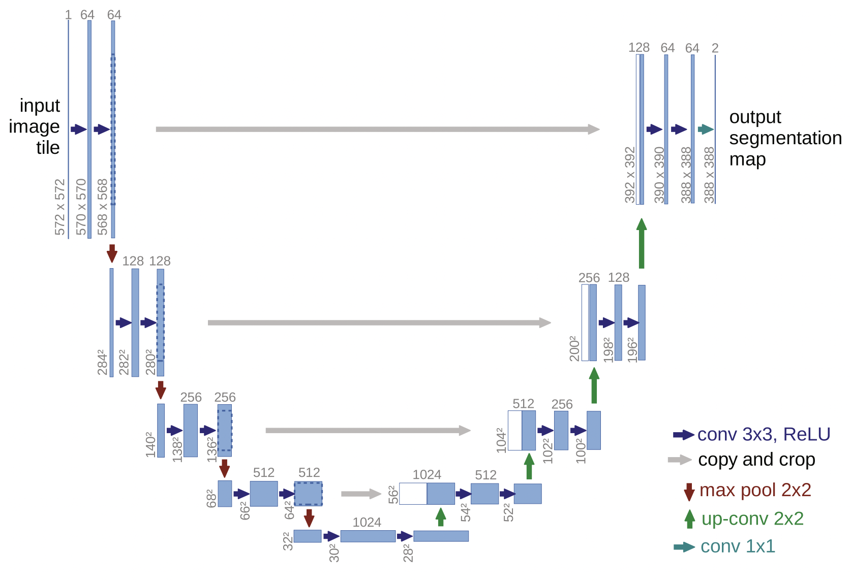 왼쪽과 오른쪽 부분 모두 Convolution(ReLU)가 동일하게 사용된다는 공통점이 있지만, 왼쪽은 Max Pooling(Downsampling)을 하고, 오른쪽은 Upsampling을 한다는 점이 다릅니다. 추가적으로, 왼쪽에서 특정 Layer의 결과를 Crop해서 오른쪽에서 Copy 하는 작업을 진행합니다.