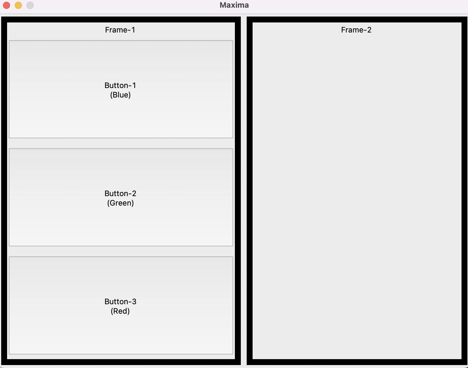 다음과 같은 과정을 통해 윈도우 창 내에 2개의 프레임을 생성 후 3개의 버튼을 생성하여, 각 버튼을 클릭 시에 2번째 프레임의 Background Color을 Blue, Green, Color로 변환하는 버튼들을 생성해보겠습니다.