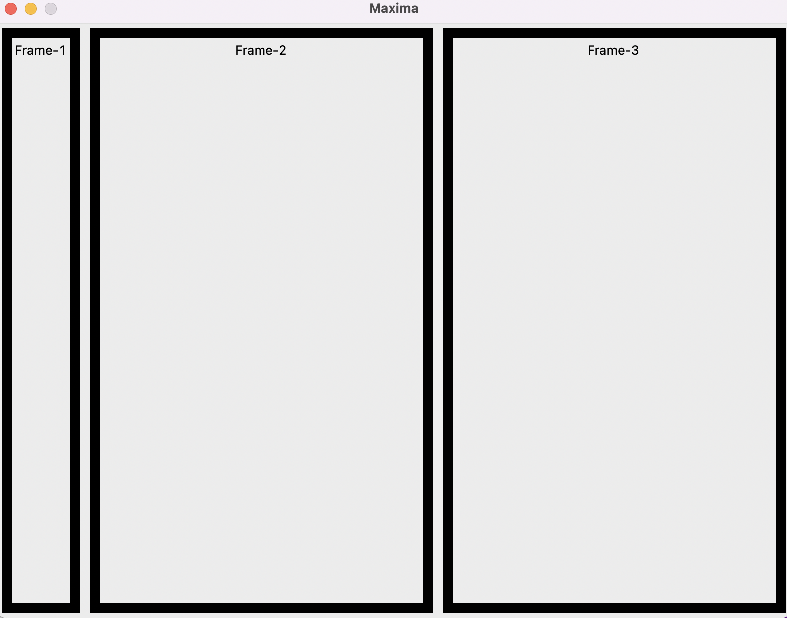 위의 코드에서 pack() 적용 시 side="left" 옵션을 통해 좌측 부터 Frame을 생성하며, padx=5, pady=5 옵션을 통해 서로 다른 Frame들 간에 x축 방향으로 5 만큼, y축 방향으로 5만큼 간격을 설정합니다. 추가적으로, fill="both", expand=True 옵션을 통해 각 Frame별 padx와 pady를 통해 확보한 영역에 대해 Frame의 크기를 채우고 확장시킵니다.